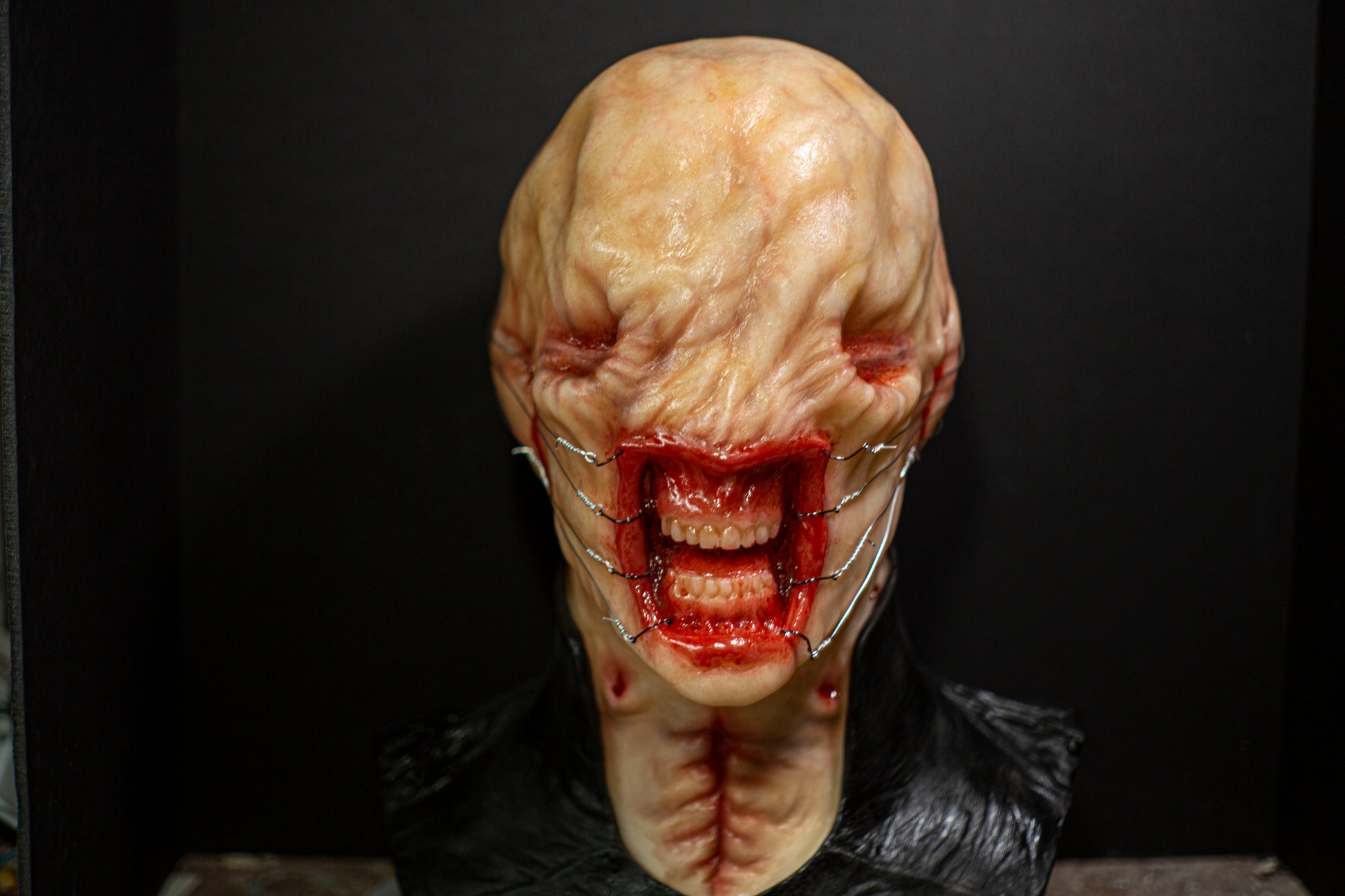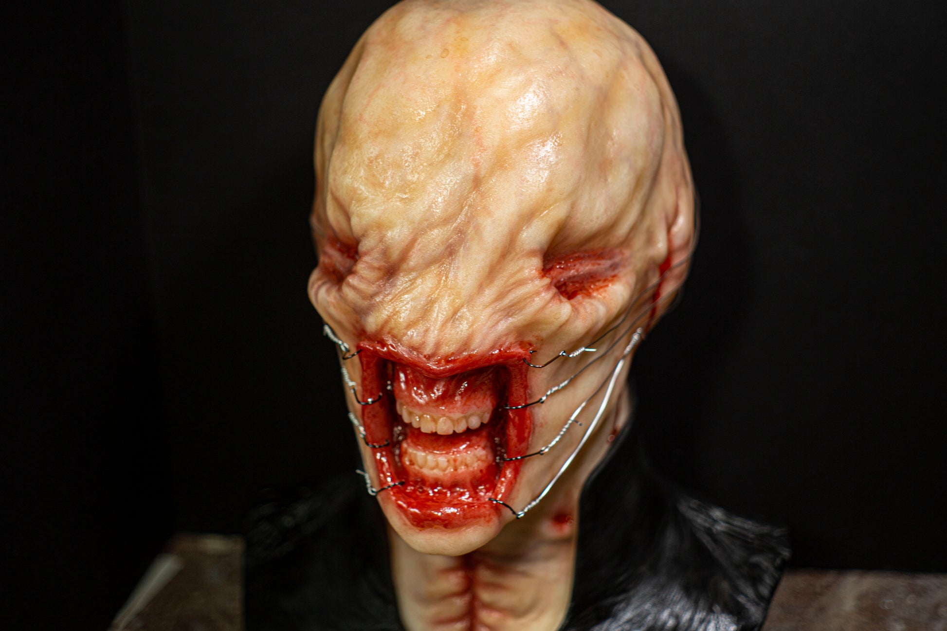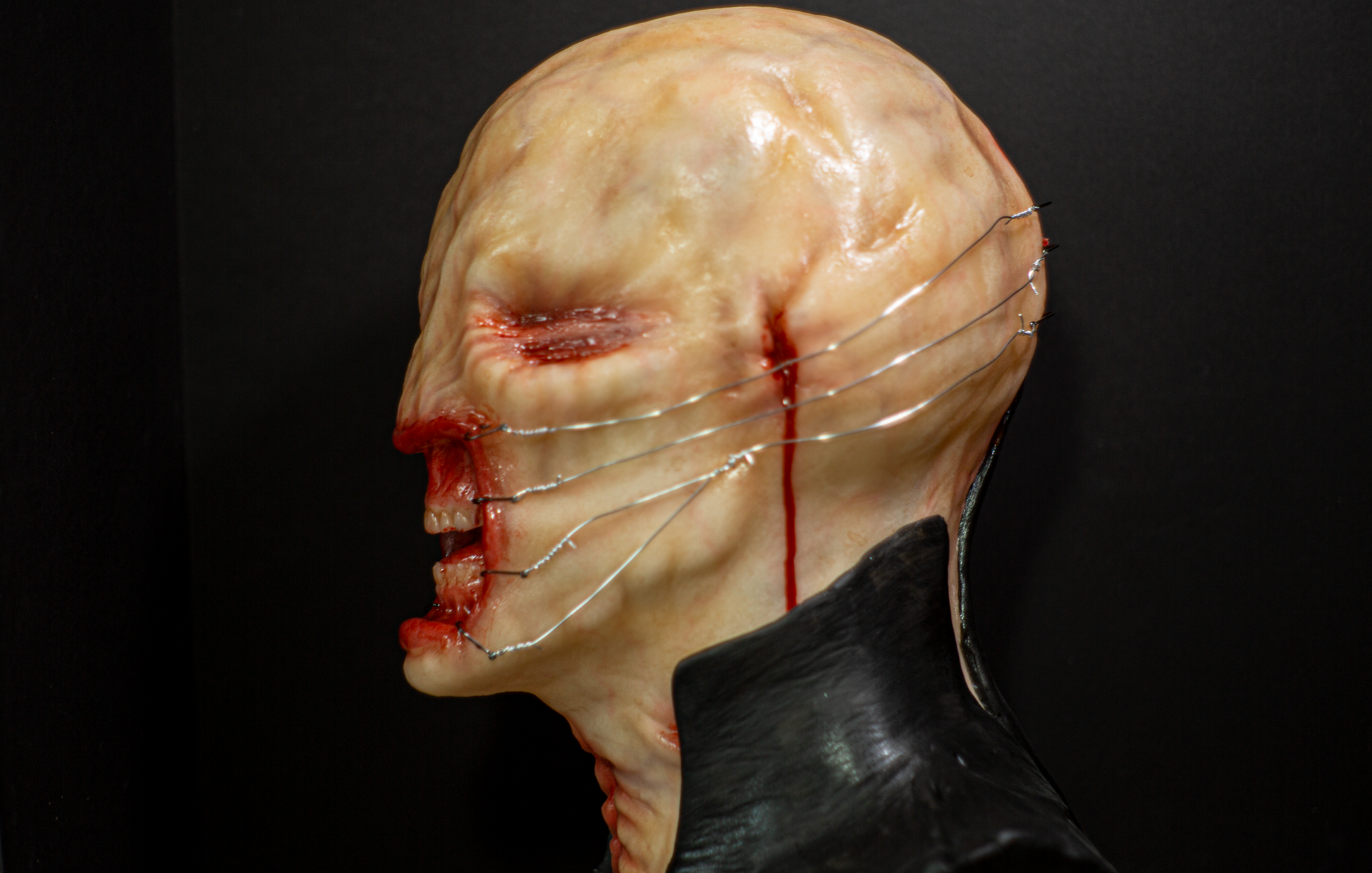 This 1:1 scale hollow resin bust of the famous cenobite from the Hellraiser films has been captured in full detail, color and style. Including metal fish hooks embedded into the face and back of the head, this copy of the bust in translucent resin will be the center of any cenobite collection!