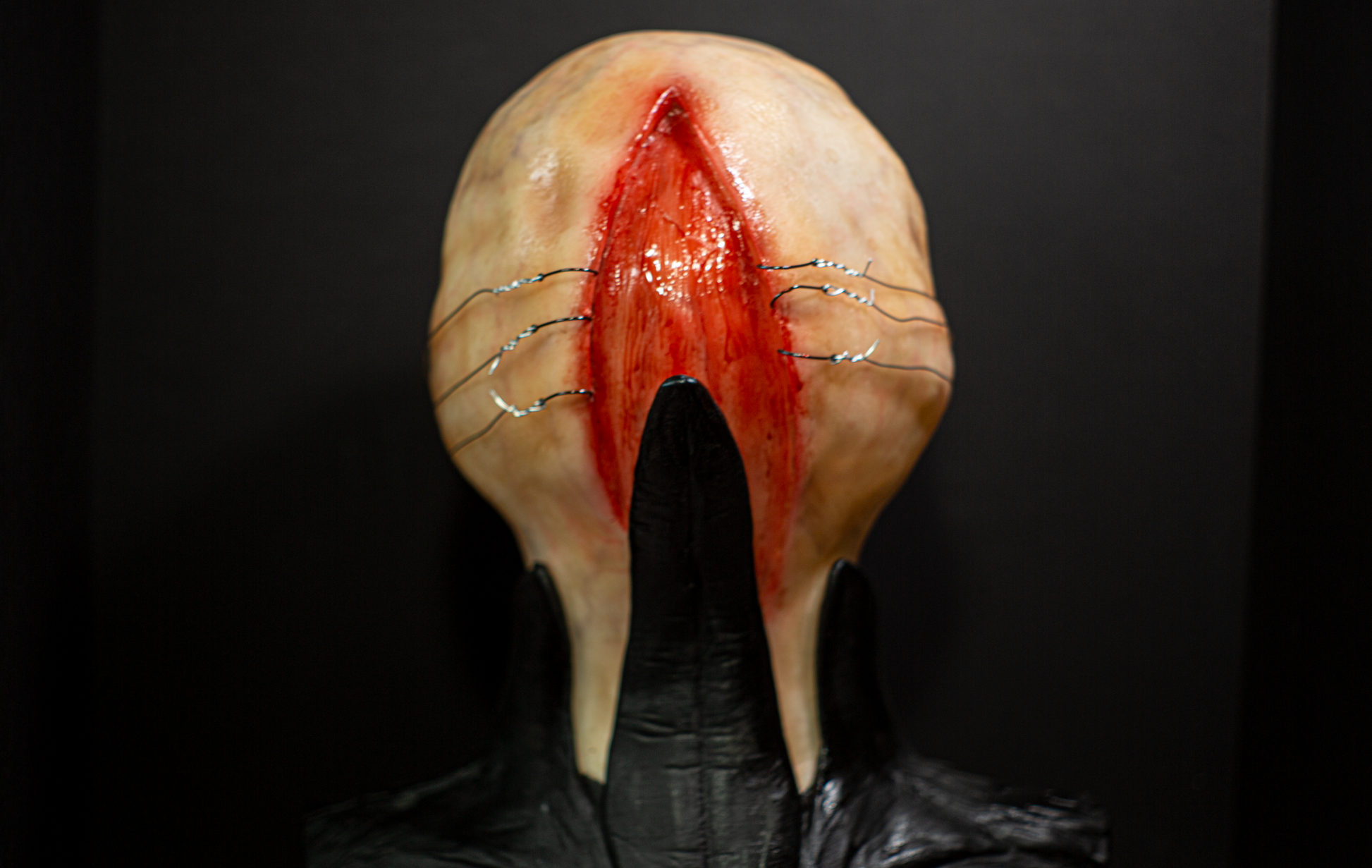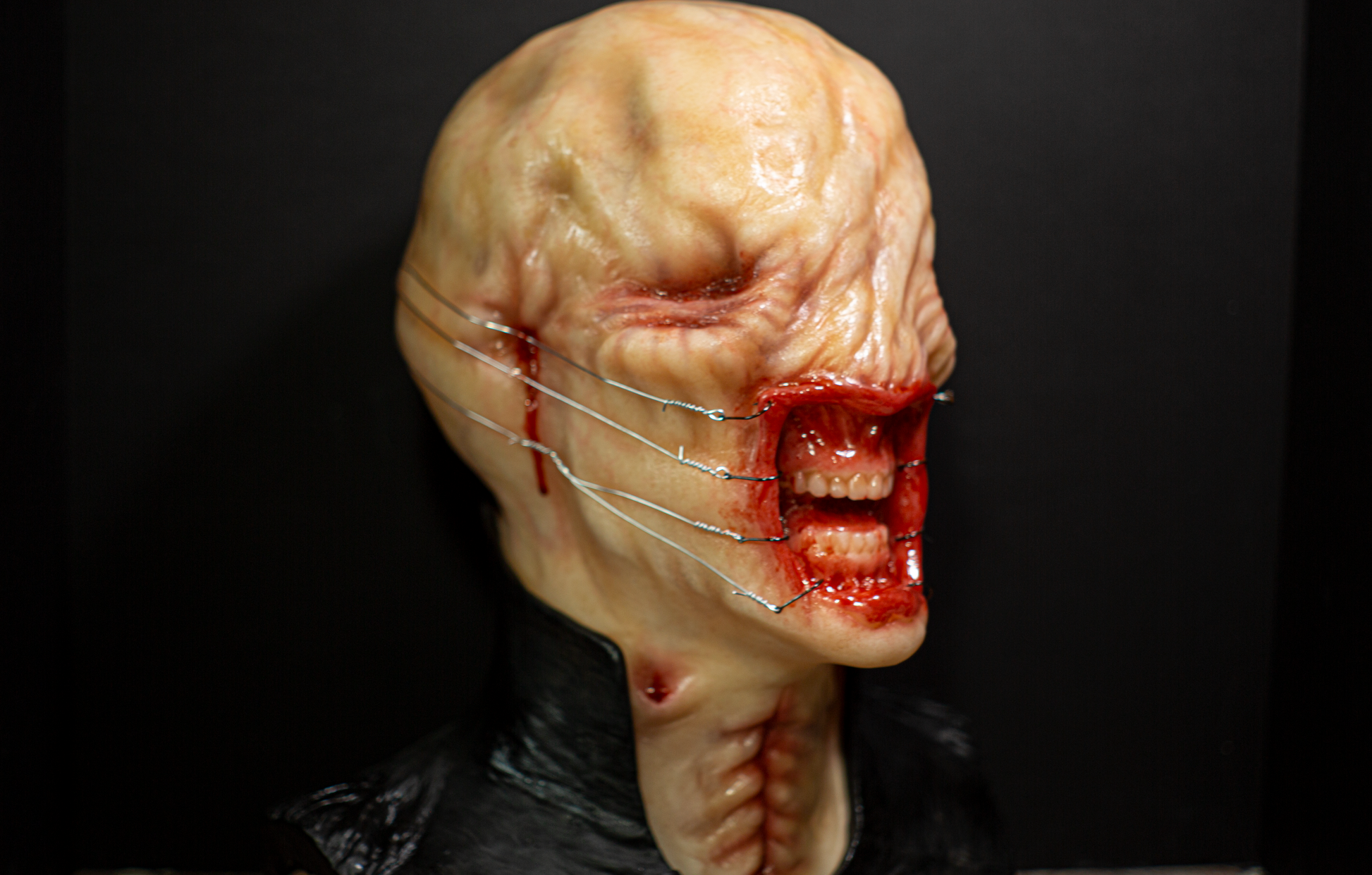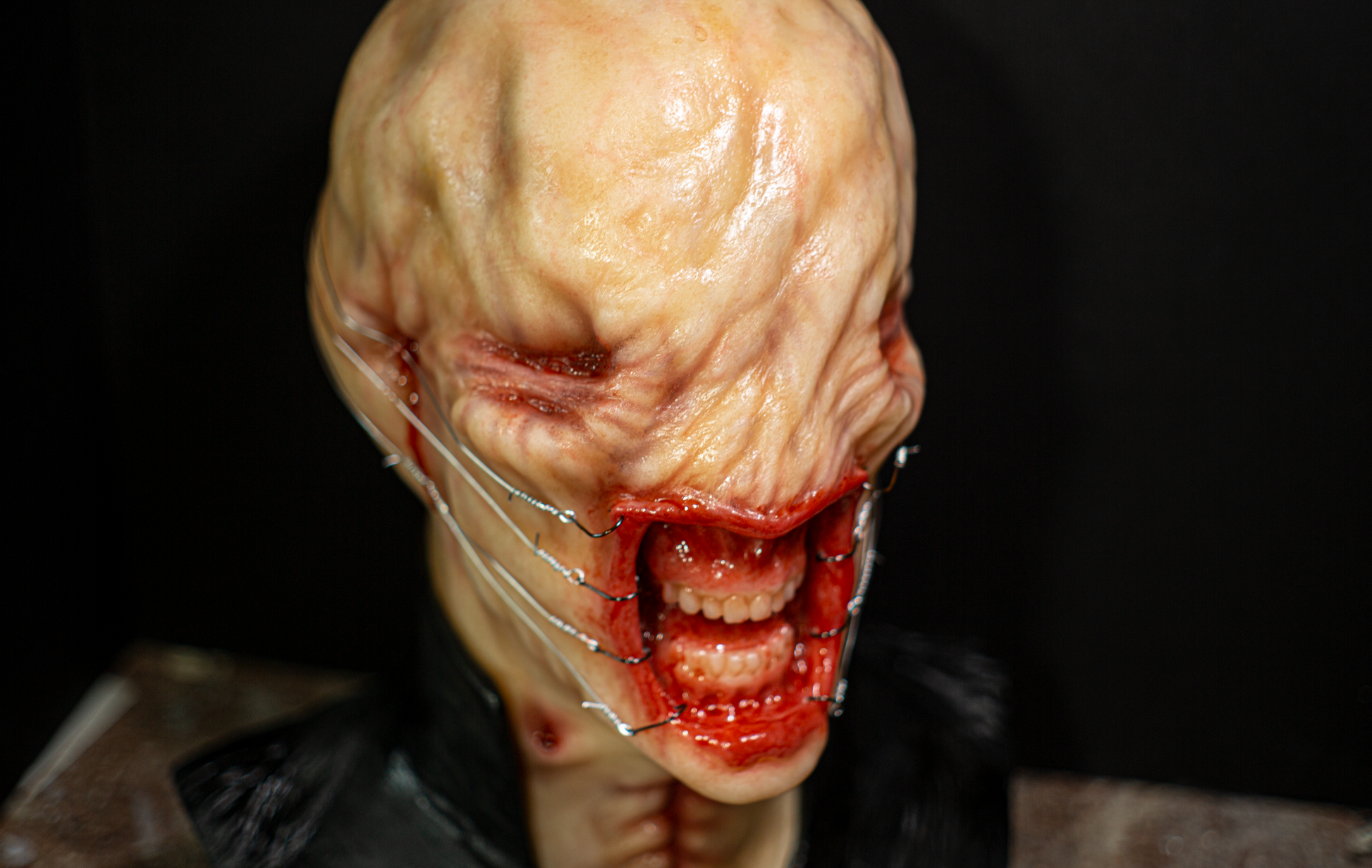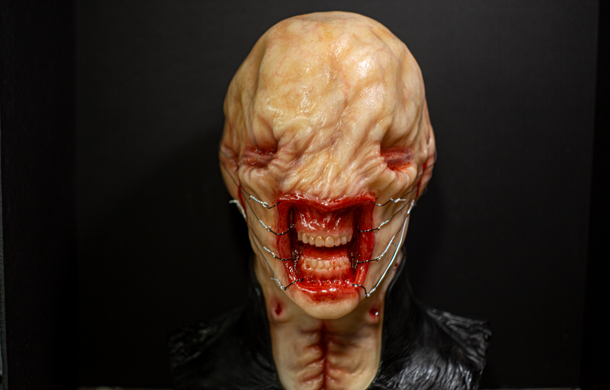 This 1:1 scale hollow resin bust of the famous cenobite from the Hellraiser films has been captured in full detail, color and style. Including metal fish hooks embedded into the face and back of the head, this copy of the bust in translucent resin will be the center of any cenobite collection!